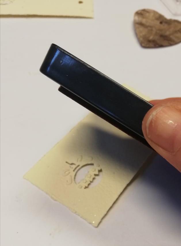 Postup je zasa veľmi jednoduchý, papier si poskladáme, aby nám vznikli časti vhodnej veľkosti a kusov. Natrháme ho na dieliky, Každý dielik vložíme do vyrezávatka s razbou tak, že zarovnáme hranu papiera s hranou dierovača a odierujeme. Vzviknutú razbu prejdeme jemne razítkovacou poduškou, tým sa zvýrazní motív mašličky a hviezdičiek. Prejdeme aj všetky hrany papiera. Na opačnom konci papiera ako je vyryzená guľa urobíme dierku na prevlečenie šagátu. Z druhého papiera si vysekneme visačku, ktorej tiež opatinujeme všetky hrany razítkovacou poduškou. Urobíme dierku. Napíšeme meno, pospájame navlečením na špagát a možeme pripevniť k darčeku.