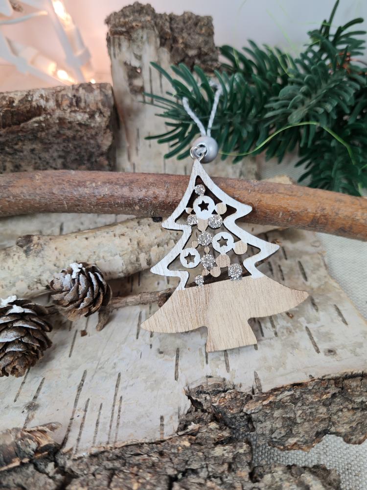 Materiál je 5mm preglejka, rozmer 6,6x6cm, prírodné drevo dozdobené bielou farbou a striebornými trblietkami + drevená korálka striebornej farby