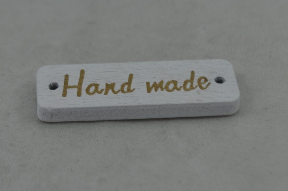preglejka, natretá bielou farbou so zlatým nápisom Hand made, s dvoma dierkami na prišitie, 30x10x3mm