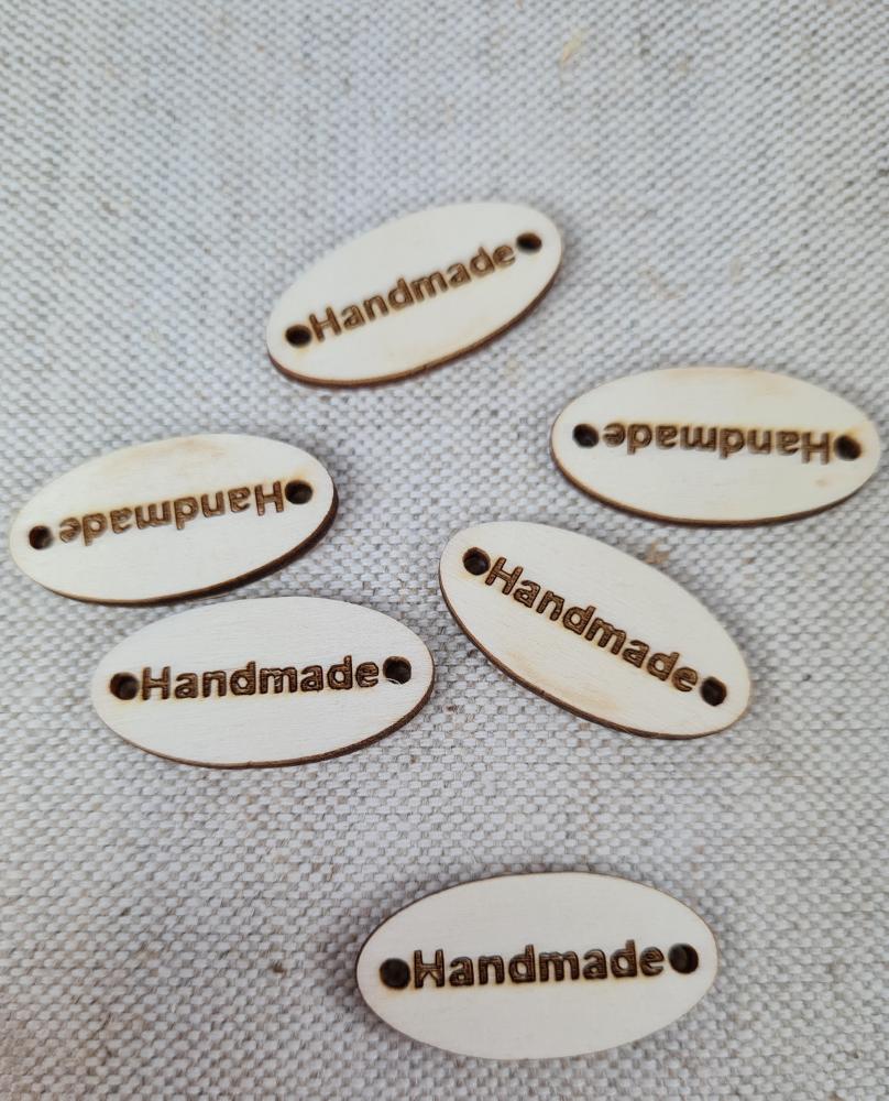 preglejka, ovál s vypáleným nápisom Hand made, s dvoma dierkami na prišitie, 3x1,5cm