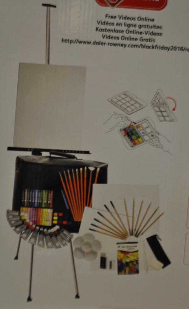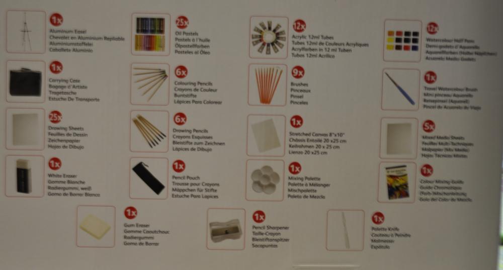 Sada obsahuje: 1x hliníkový stojan, 1x kufrík, 25x papiere na kreslenie, 1x biela guma, 25x olejový pastel, 6x farebné ceruzky, 6x ceruzky na kresbu, 1x peračník, 12x acrylové farby 12ml, 9x štetec, 1x bavlnené plátno 20x25cm, 1x paleta, 12x aquarelové farby, 1x cestovný aquarelový štetec, 5x mixed media sheets, 1x na miešanie farieb, 1x guma, 1x strúhatko, 1x špachtľa